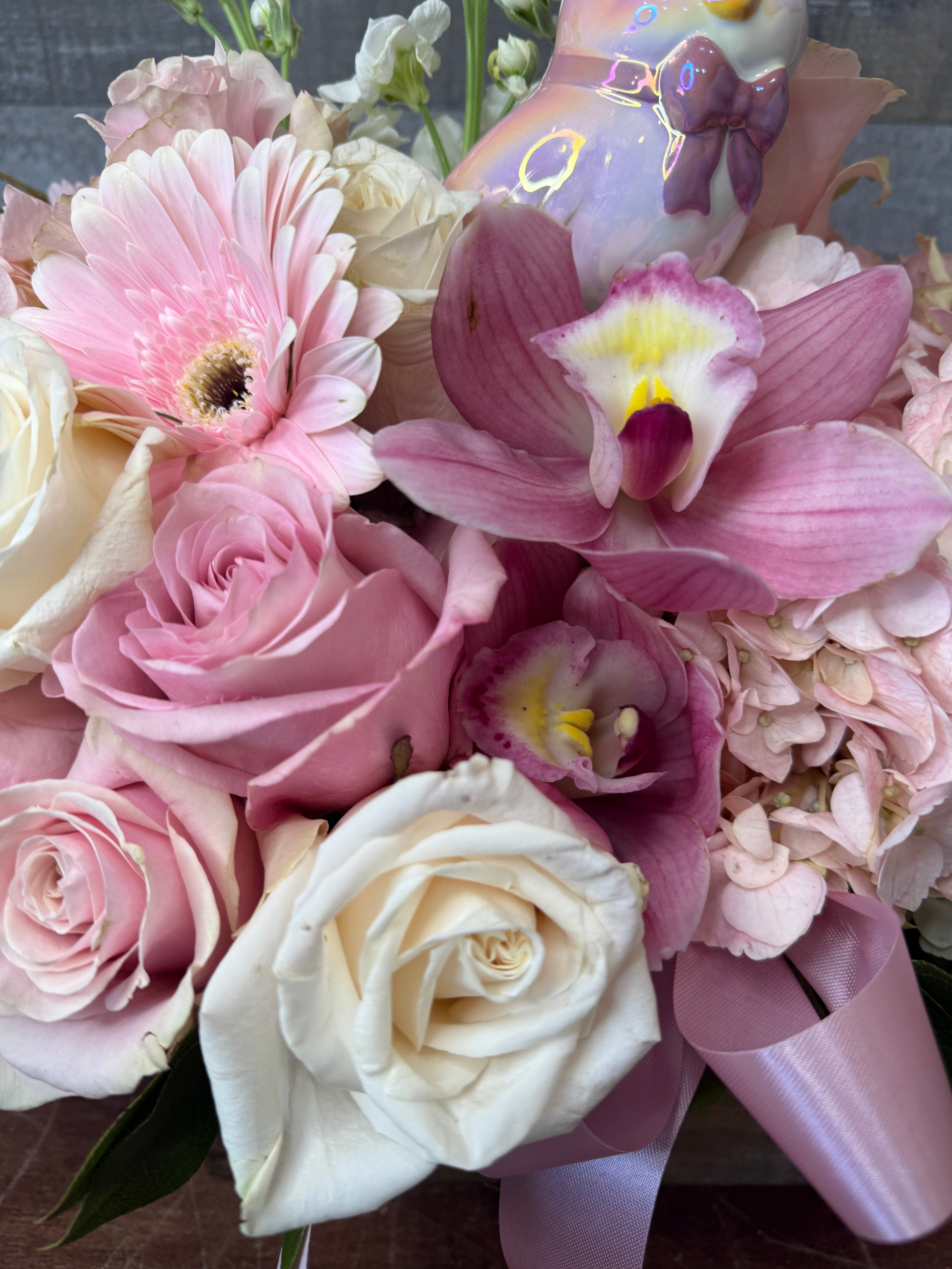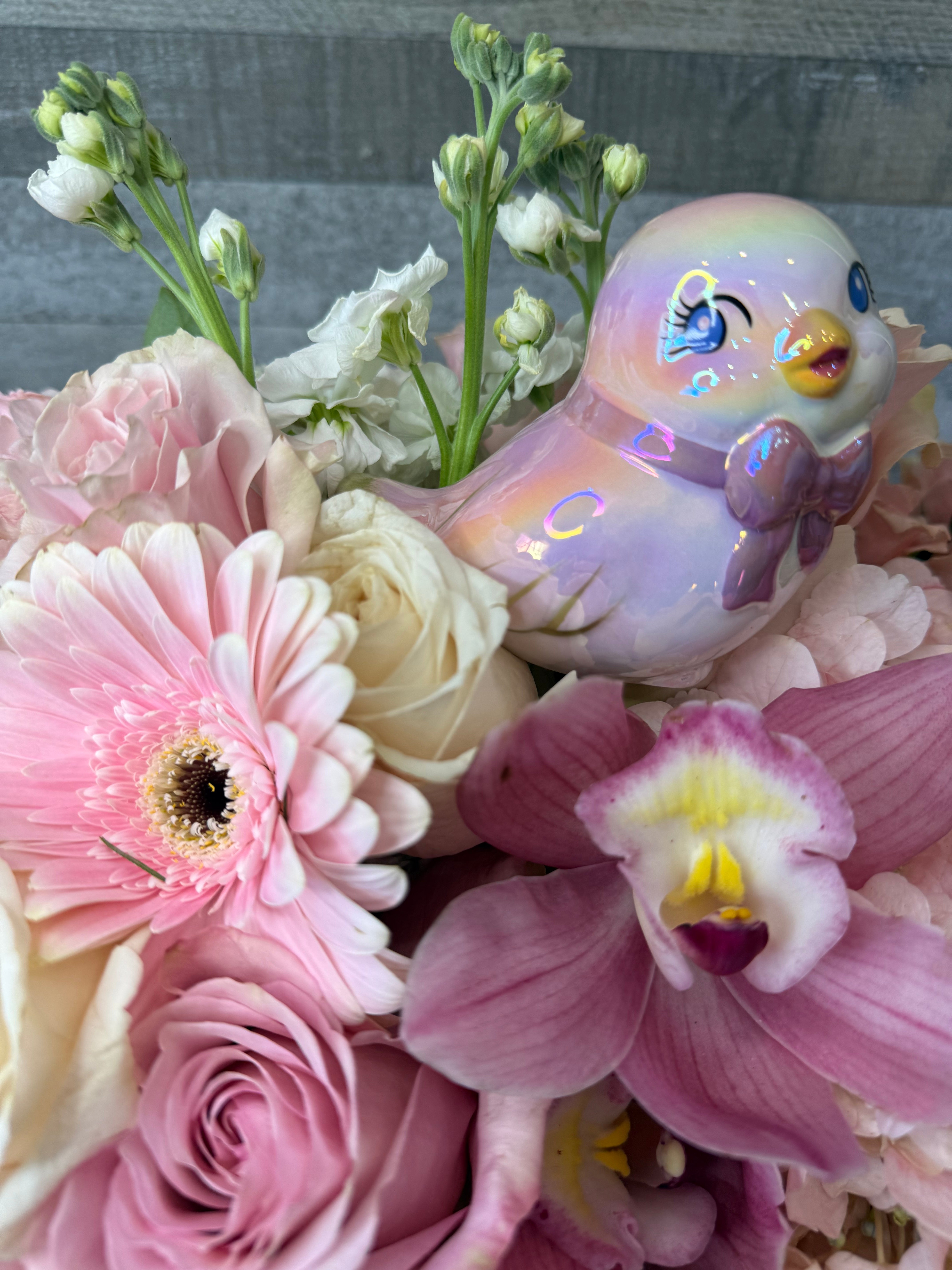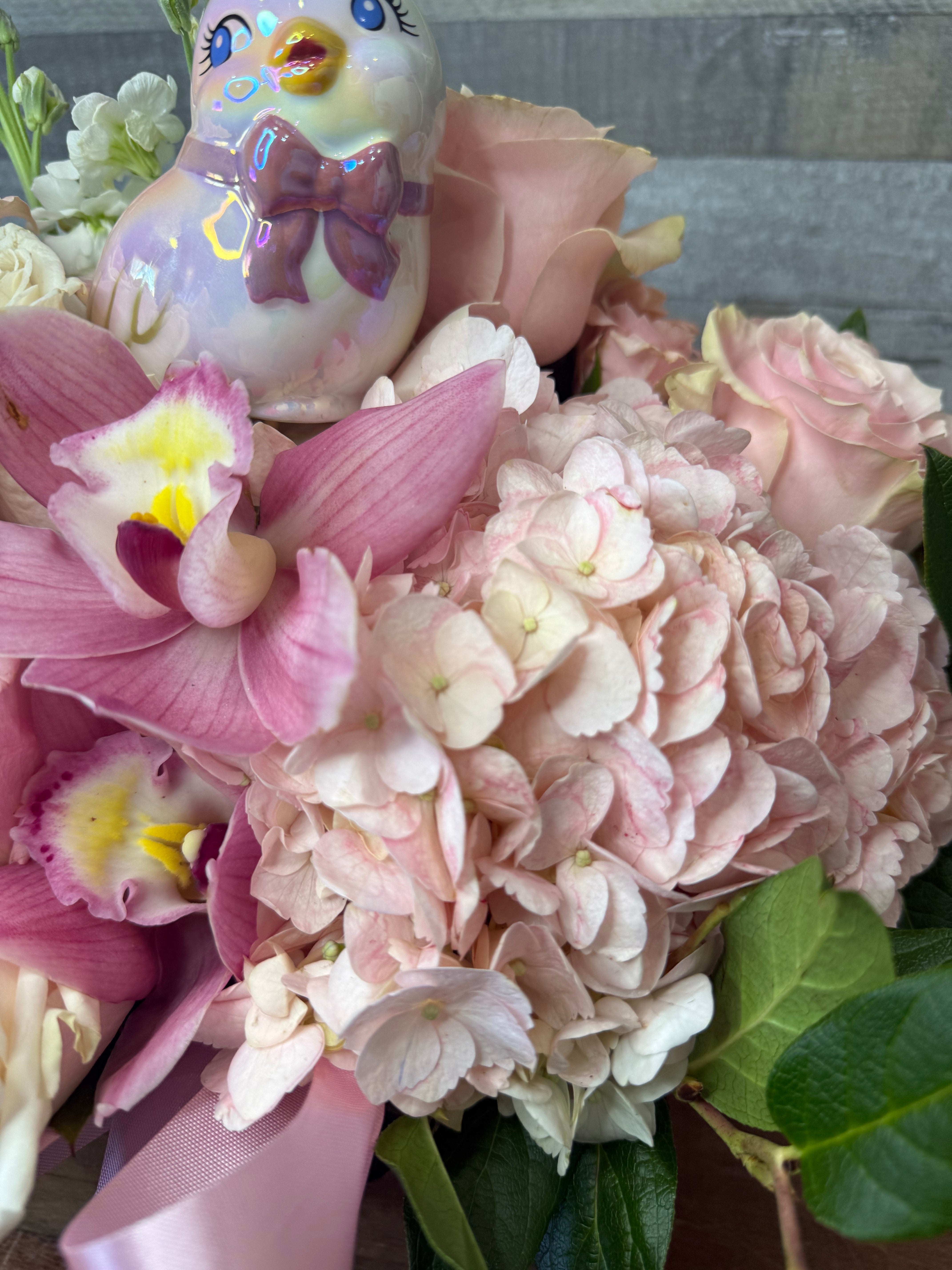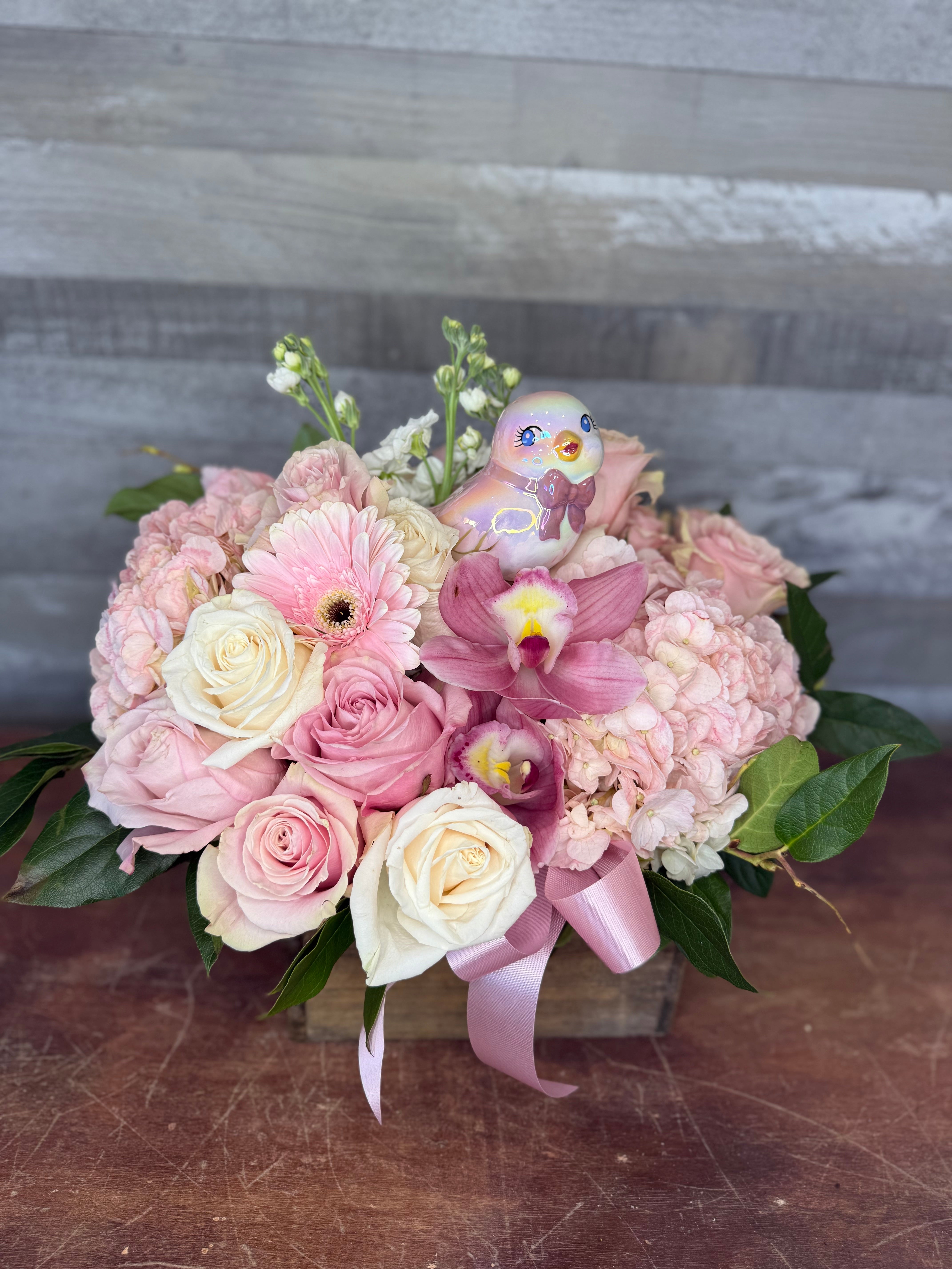 Floral arrangement with pink and white flowers, a bird figurine, and a pink ribbon in a wooden box on a wooden surface.