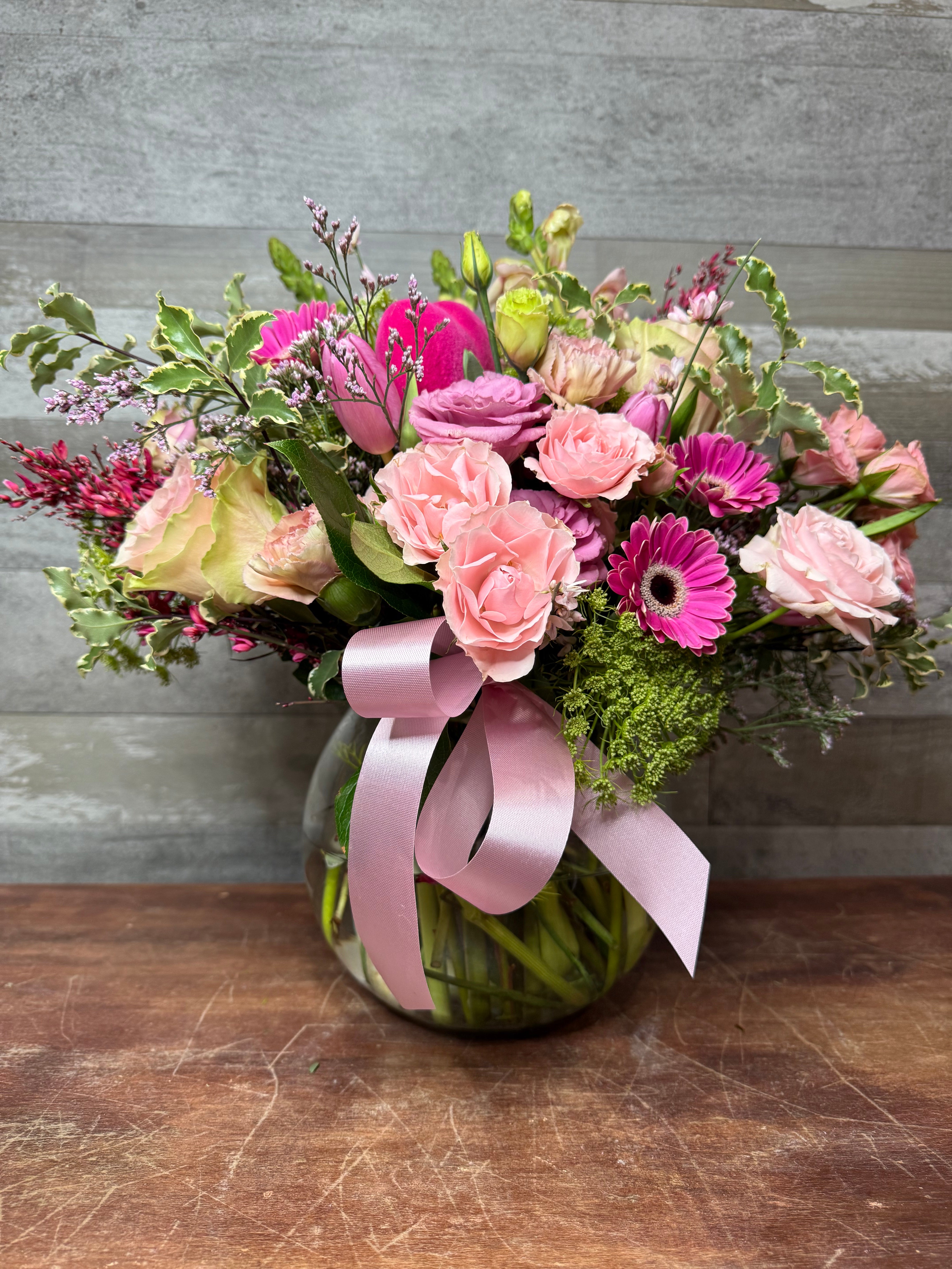 In some instances, our photo may represent an overall theme or look and include a one-of-a-kind vase, wood box, or basket which cannot be exactly replicated.